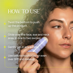 Twist and glide over the face, eye and neck area, in one to two swipes. Gently pat with fingertips to speed absorption.
